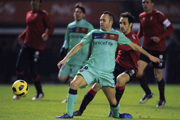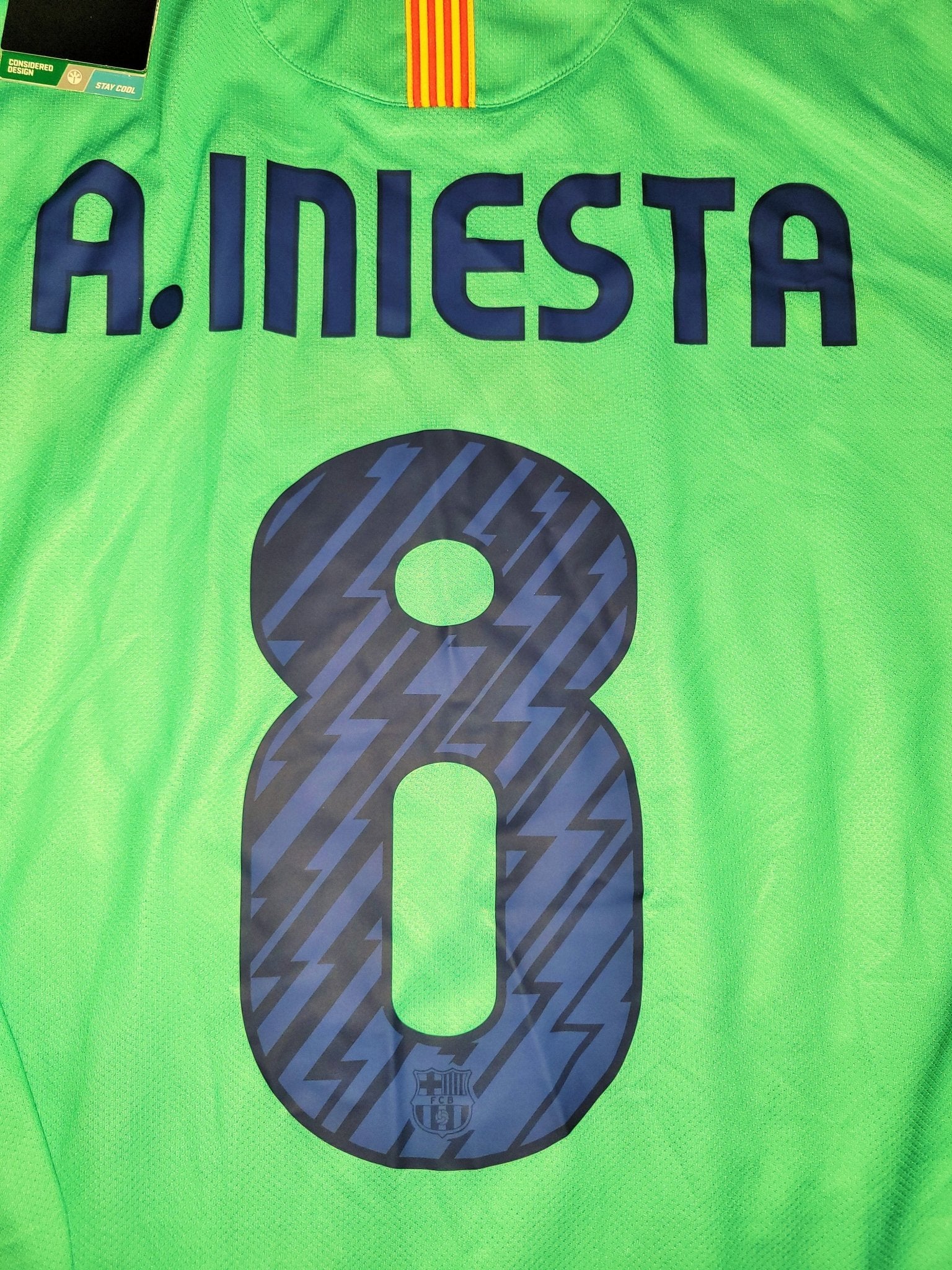 Official Andres Iniesta Barcelona Green Away Long Sleeve Jersey from the 2010 - 2011 Spanish League Season.