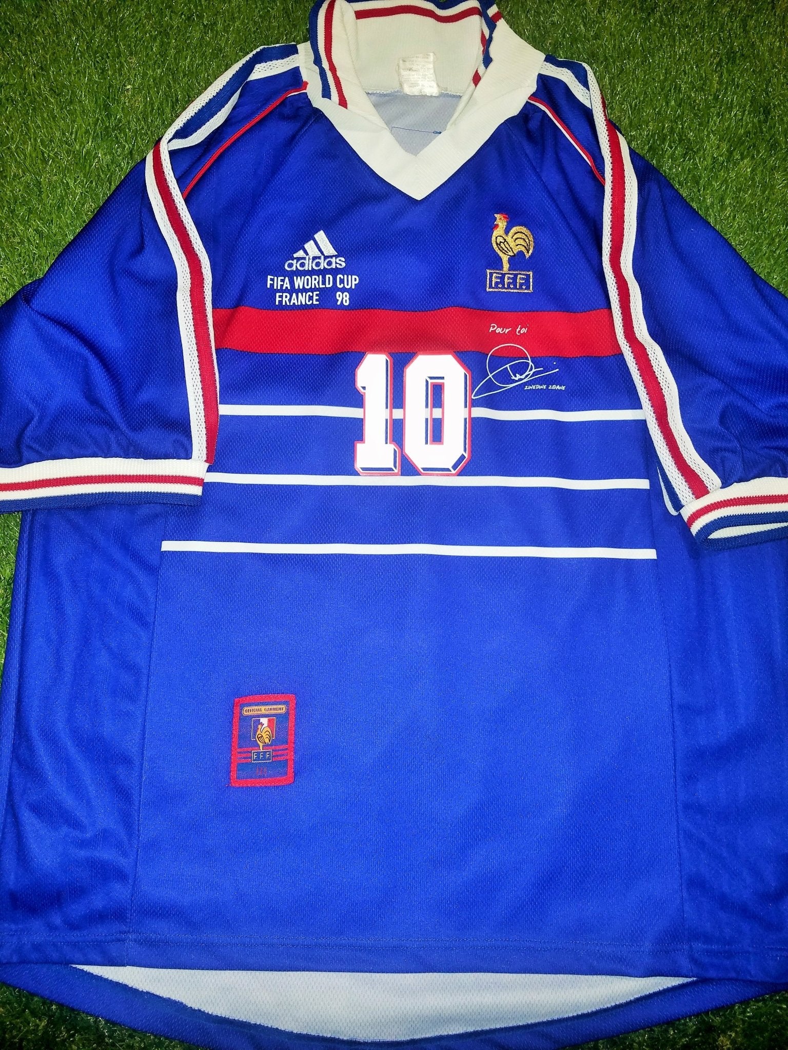 IT IS A SPECIAL LIMITED EDITION VERSION RELEASED IN 1998 WITH ZIDANE'S SIGNATURE IMPRINTED IN THE FRONT OF THE SHIRT WHICH SAYS "POUR TOI" MEANING "FOR YOU" FOLLOWED BY HIS SIGNATURE.